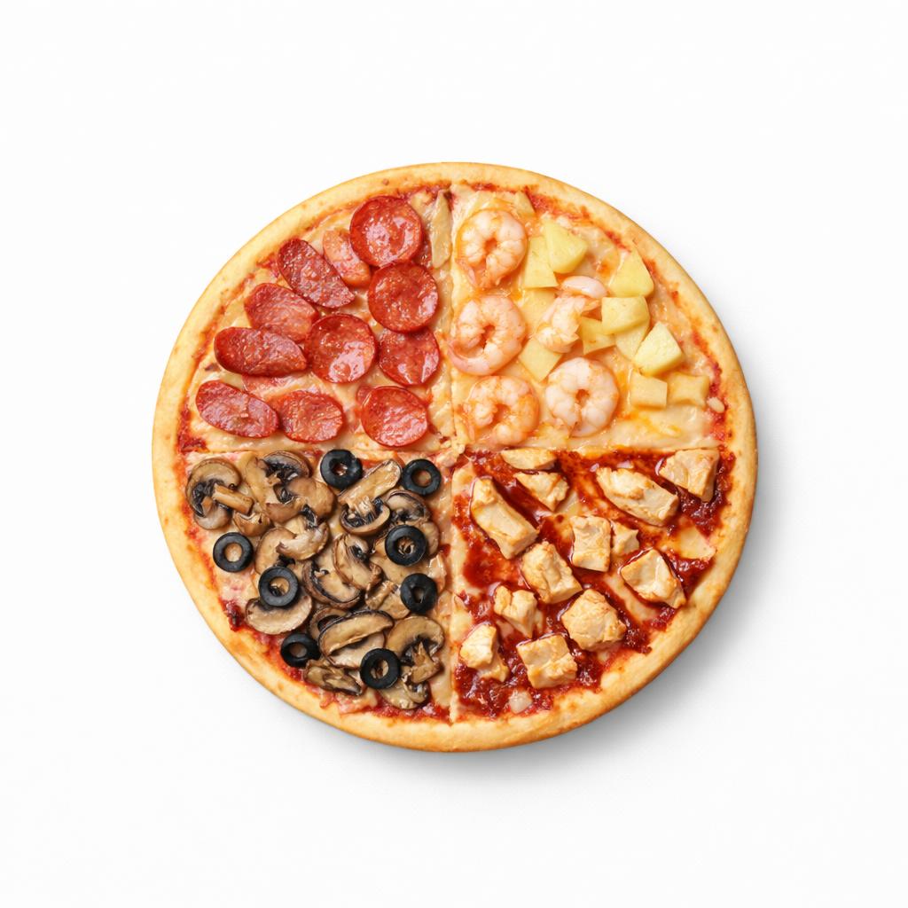 Состав: свинина, бекон, говядина, сыр моцарелла, пицца-соус, лук репчатый, цыпленок